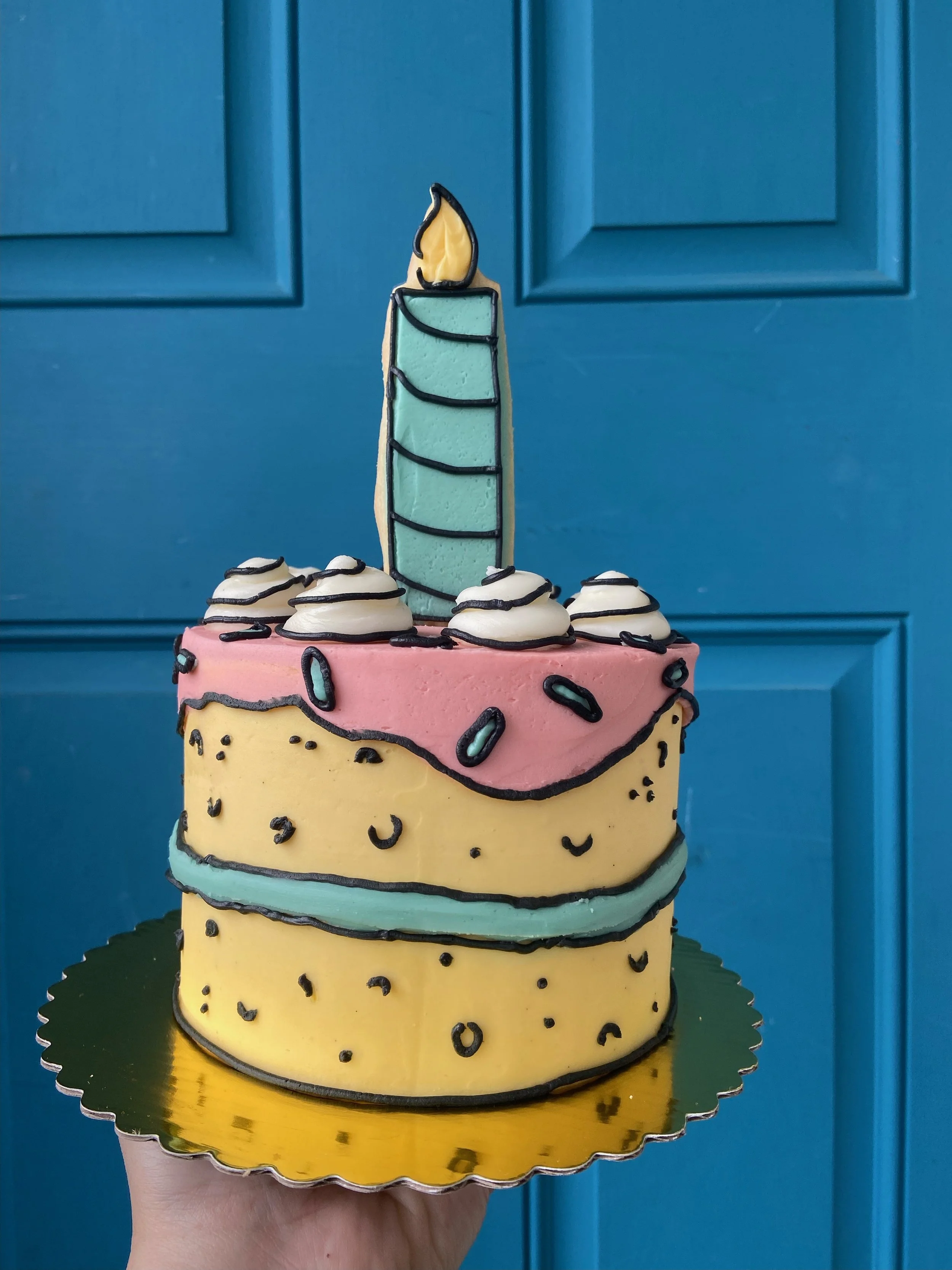 - Decorating cake in fun festive colors and outlining the details in black line work.