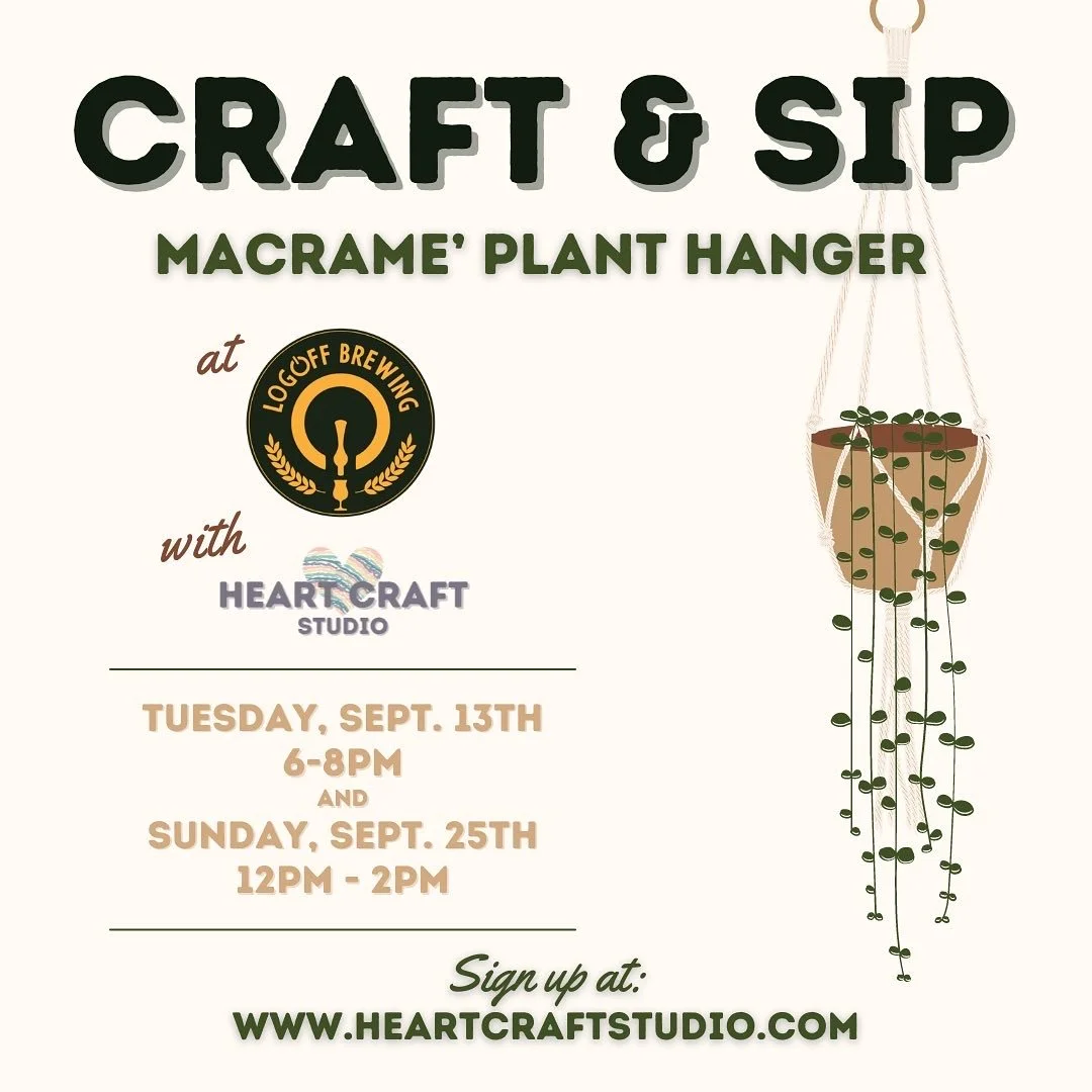Join us for Craft & Sip at Log Off - In this workshop, you will learn how to weave your own Plant Hanger Macrame’! We first learn the different knots and weaves by making a keychain first, so you will leave with one keychain, one plant hanger, and the skill and confidence to make your own macrame’ creations! These make great gifts!!