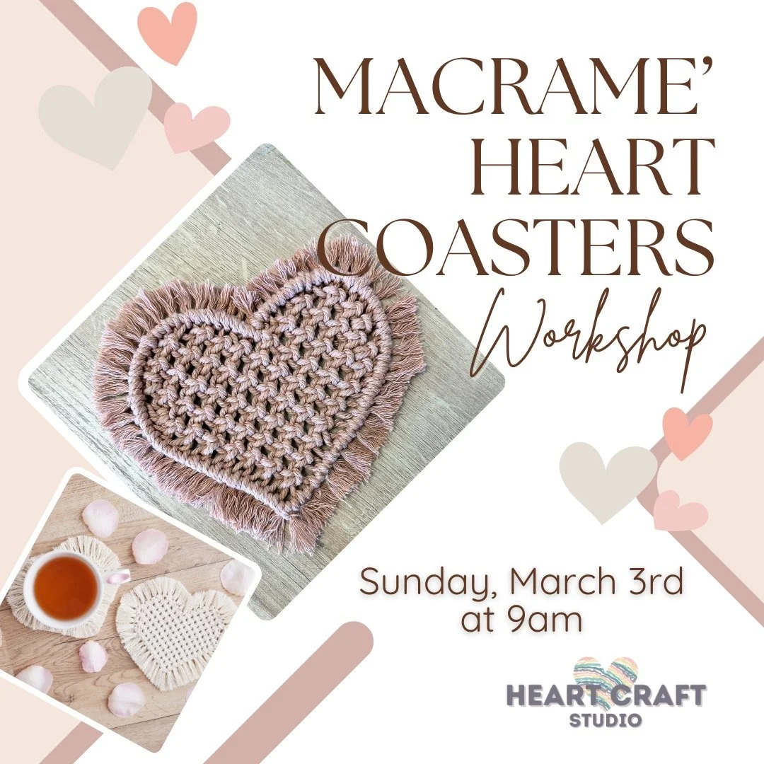Join us at our new Macrame’ Heart Coaster Workshop! In this class, you will learn how to weave your own macrame’ heart coasters!