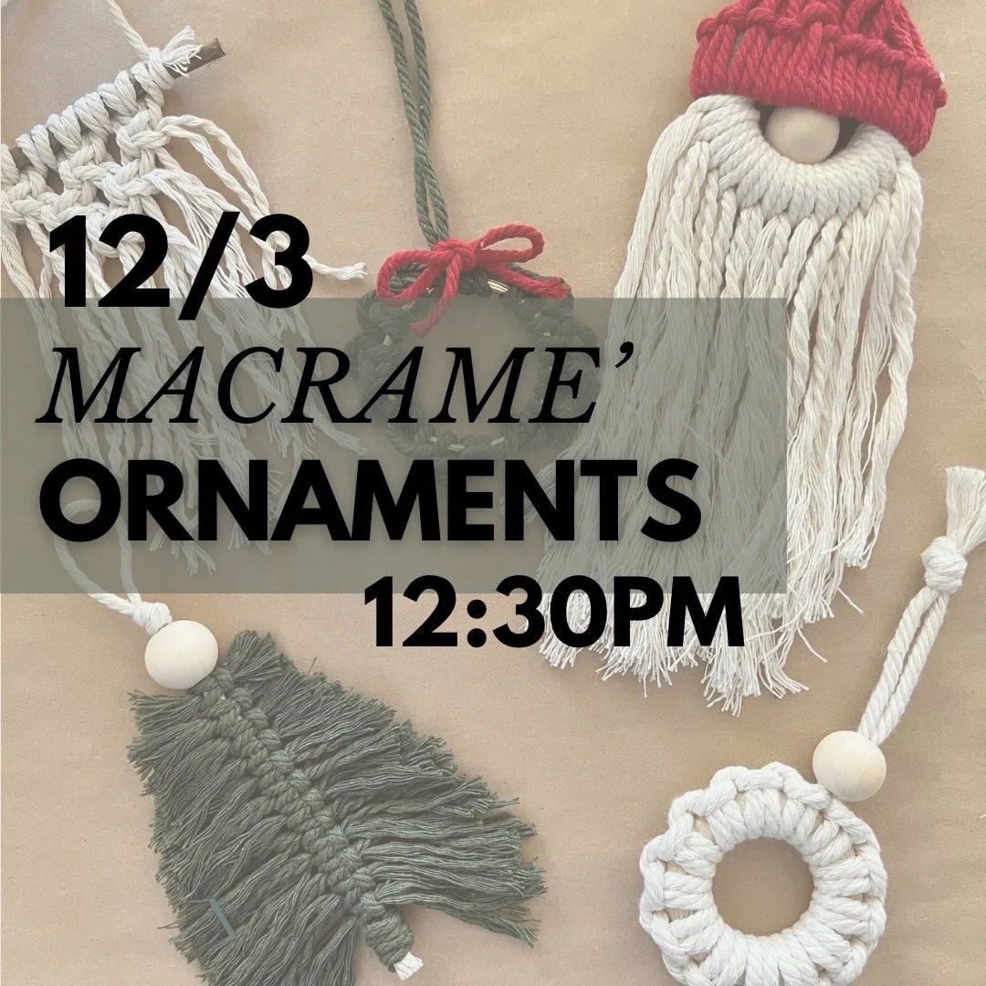 Learn how to weave your own Macrame’ ornaments! In this class, we will show you how to create three beautiful, boho macrame’ ornaments: a holiday tree, a santa gnome, and a wreath!