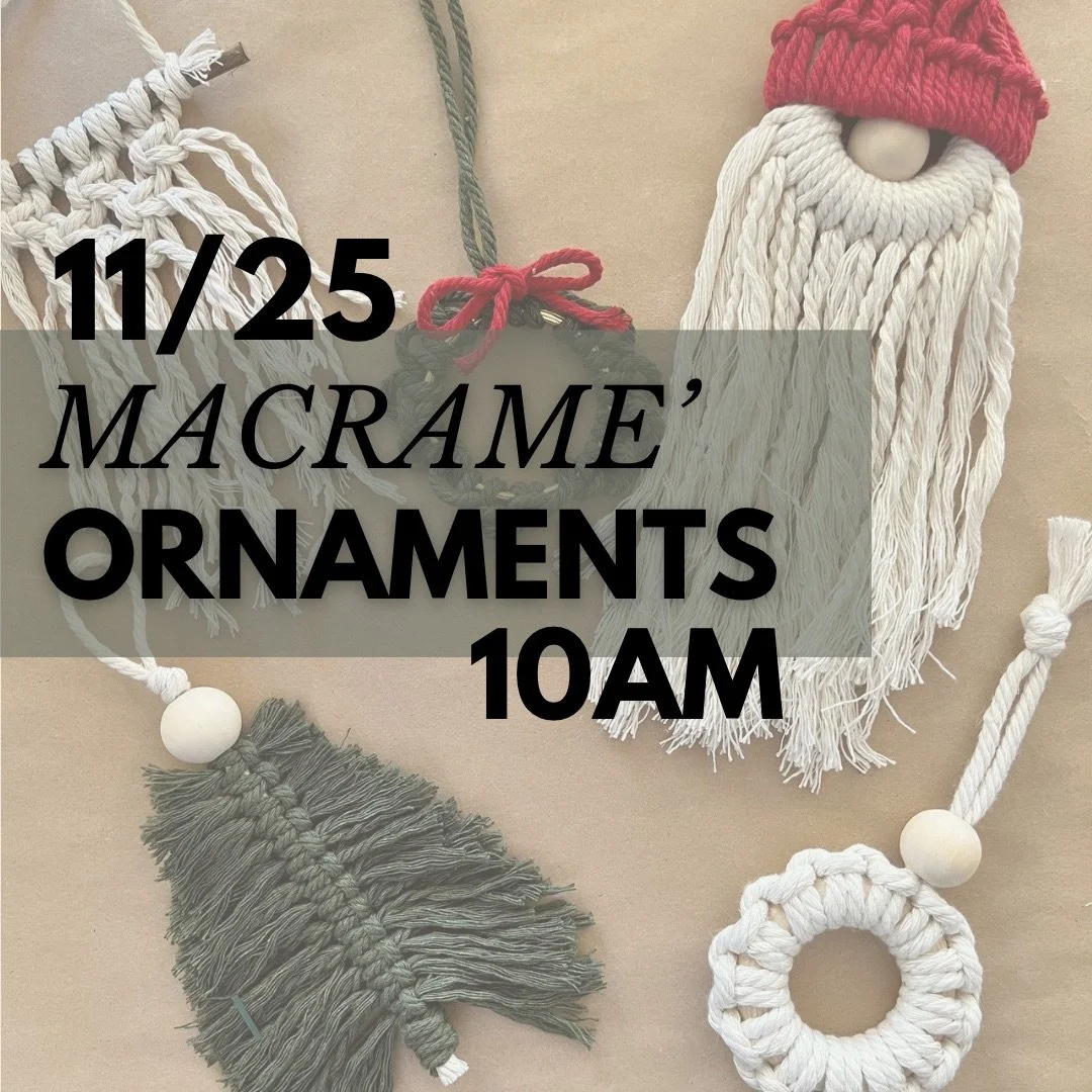 Learn how to weave your own Macrame’ ornaments! In this class, we will show you how to create three beautiful, boho macrame’ ornaments: a holiday tree, a santa gnome, and a wreath!