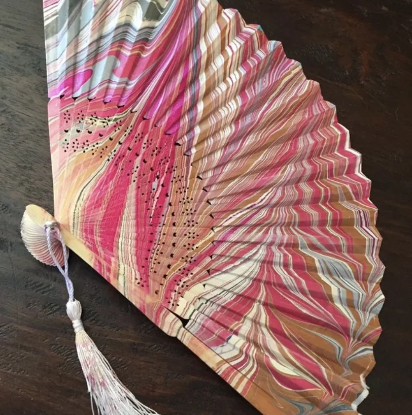 Learn the basics of the ancient technique of water marbling art through this beginning workshop. You will learn terminology, technique details and the handling of easy to use tools. You will practice dipping pulpboard coasters, small wood shapes, and a fabric fan.
