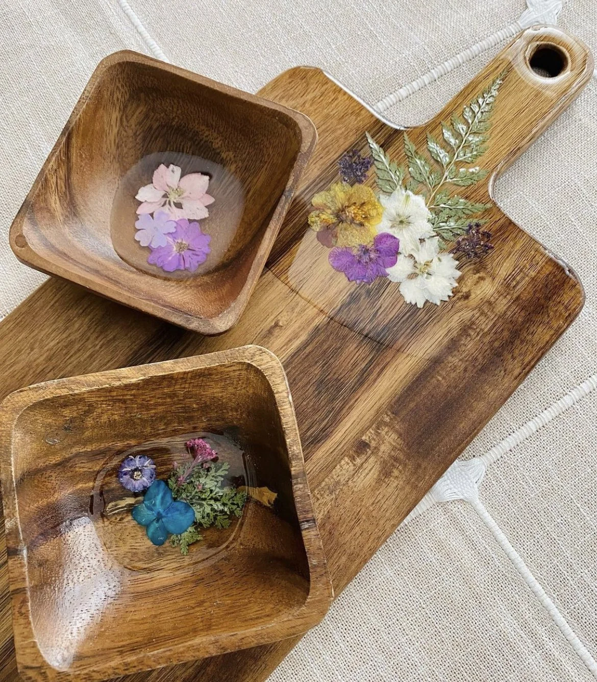 You can use crystal points to create a ring holder in a jewelry dish, or a crystal cluster for your own unique trinket dish. If you’d prefer not to use crystals, you have the option to make a preserved flower charcuterie board with clear food safe resin.